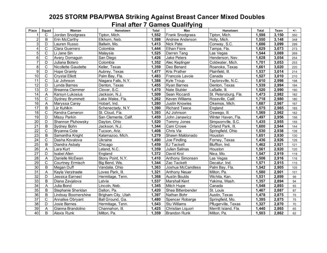HOUSTON – After two days of qualifying at the Professional Bowlers Association/Professional Women’s Bowling Association Striking Against Breast Cancer Mixed Doubles, Frank and Jordan Snodgrass of Tipton, Michigan, took the overall lead heading into Sunday’s semifinal round with a combined seven-game total of 3,150.